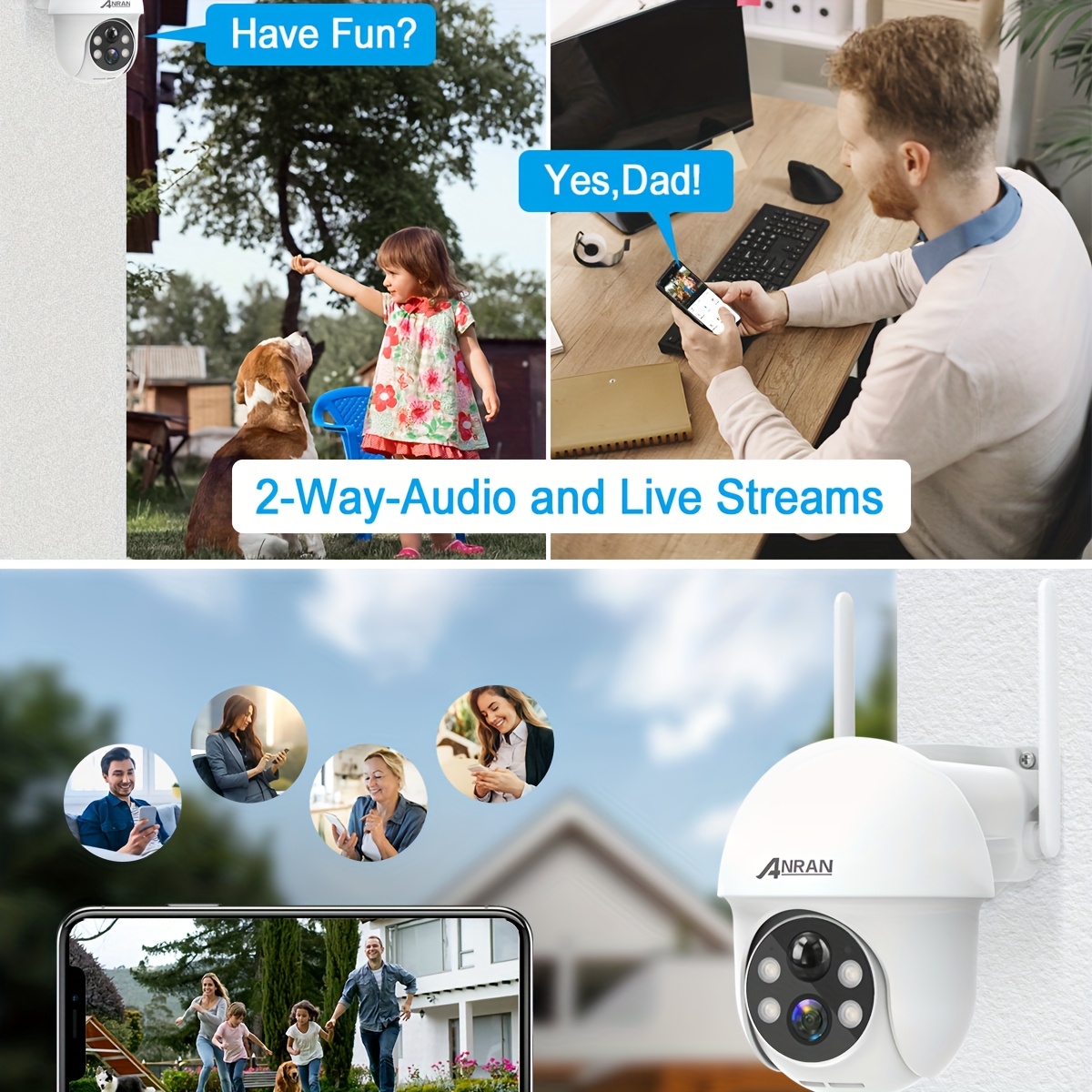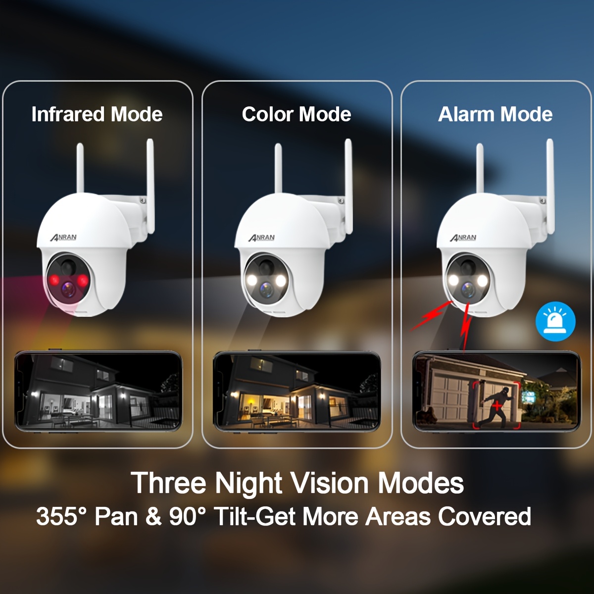 La caméra extérieure ANRAN offre une rotation de 355° et une vision nocturne couleur de 3MP, améliorée par 4 projecteurs pour des images nocturnes éclatantes. Elle comprend des capacités infrarouges et permet aux utilisateurs de choisir parmi trois réglages de vision nocturne : couleur, infrarouge ou mode intelligent, réglables via l’application. Avec son angle de vue étendu, la caméra peut tourner de 355° horizontalement et de 90° verticalement pour une couverture exhaustive.