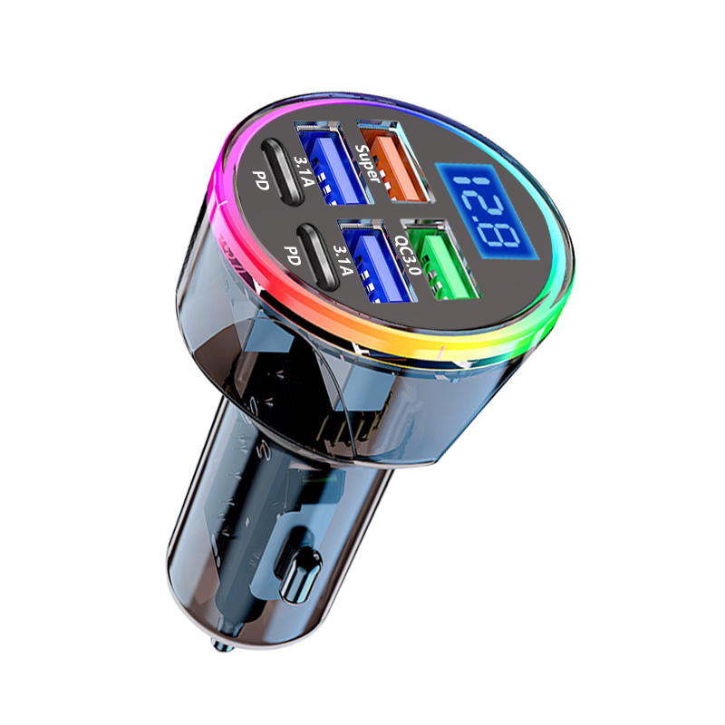 6-en-1 Chargeur de voiture USB-C semi-transparent avec adaptateur de charge rapide 200W, compatible PD et QC3.0, prise universelle 12V-24V à lumière ambiante RGB et affichage numérique du voltage, idéal pour iPhone 15/14/13/12/11/Galaxy/Pixel