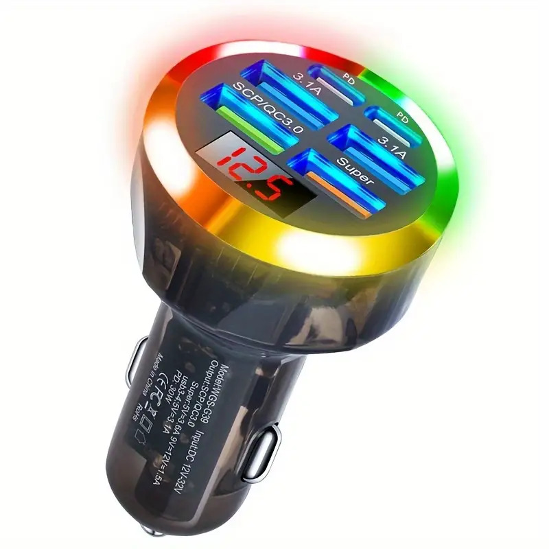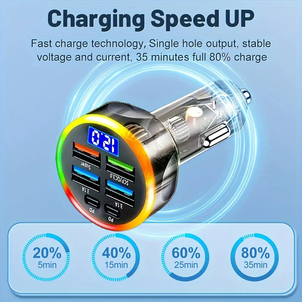 8 avis pour 6-en-1 Chargeur de voiture USB-C semi-transparent avec adaptateur de charge rapide 200W, compatible PD et QC3.0, prise universelle 12V-24V à lumière ambiante RGB et affichage numérique du voltage, idéal pour iPhone 15/14/13/12/11/Galaxy/Pixel