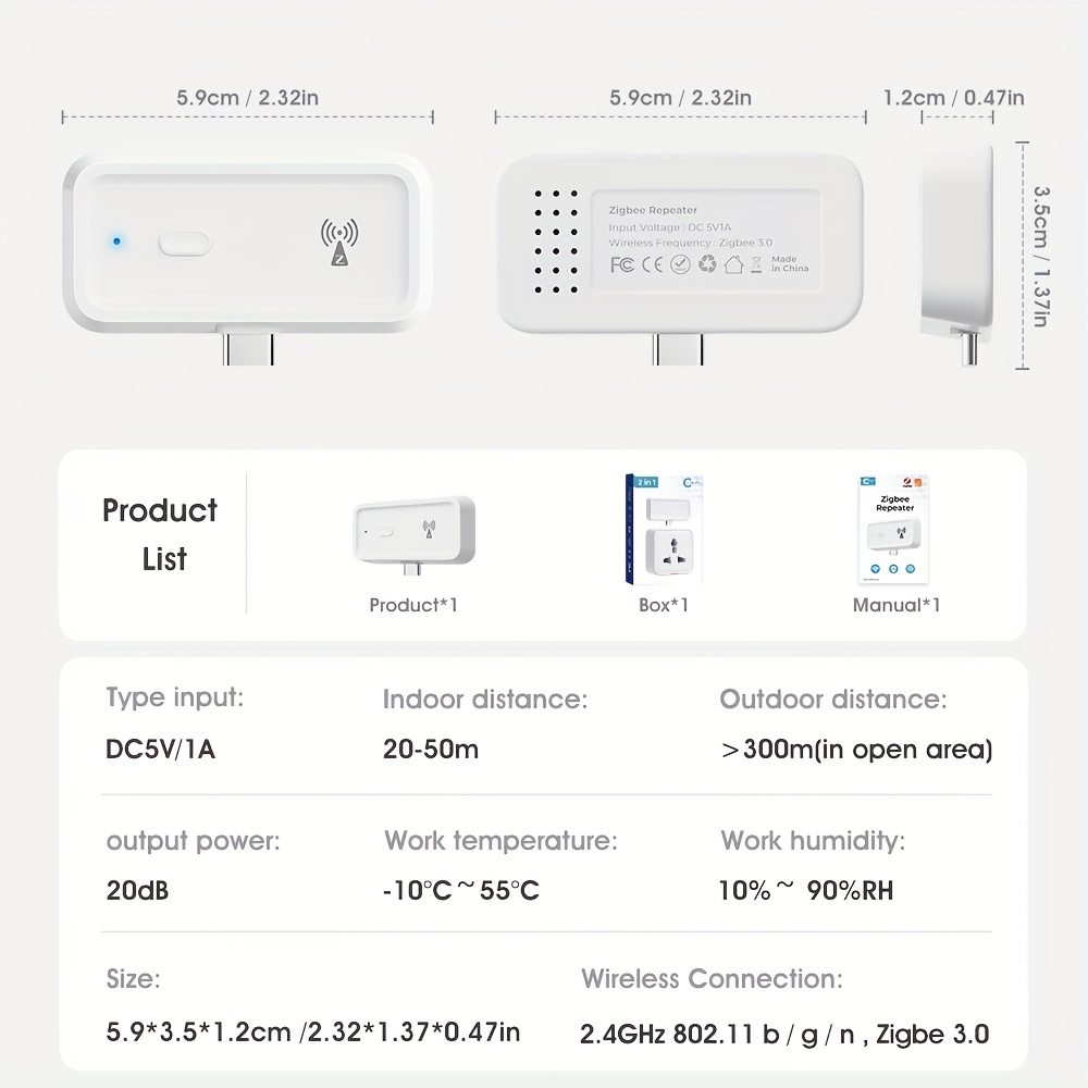Spécifications :Entrée Type-C : DC5V 1A, Sortie :Puissance de sortie : 20dB, Sortie :Distance intérieure : 20-50m, Sortie :Distance extérieure : >300 m (zone ouverte)Température de fonctionnement : -10 ℃ ~ 55 ℃Humidité de fonctionnement : 10 % à 90 % HRProtocole sans fil : 2,4 GHz 802.11b/g/n, Zigbee 3.0Taille : 5,9 * 3,5 * 1,2 cm