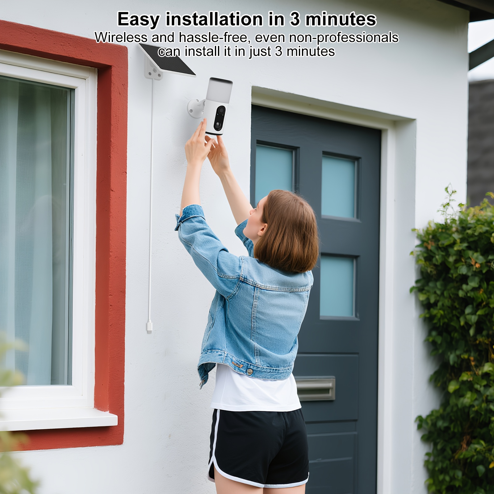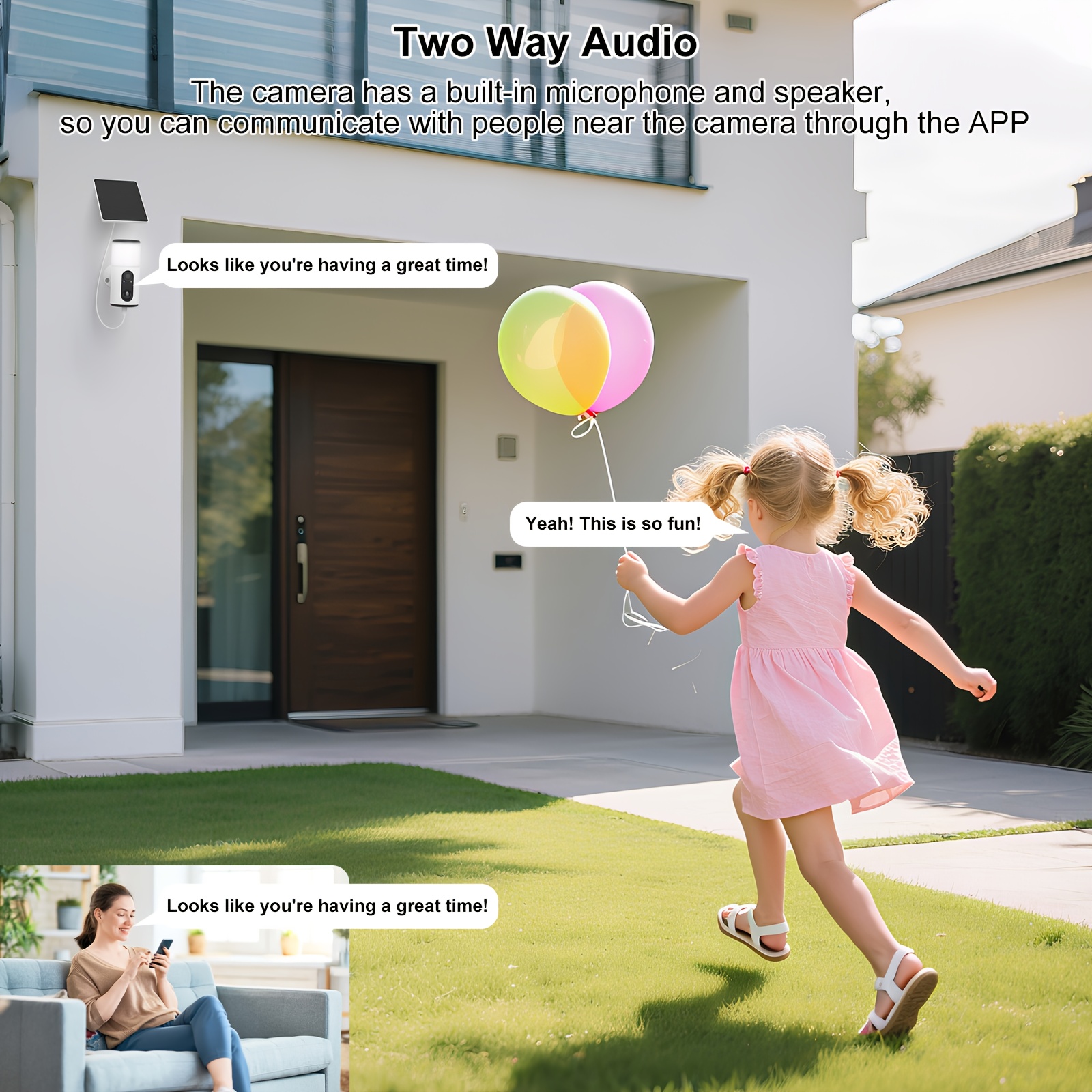 Cet appareil peut être configuré rapidement sans avoir besoin de travaux électriques, car il est doté d’un Wi-Fi 2,4 GHz intégré : il suffit de le brancher, de se connecter et il est opérationnel ! La caméra à énergie solaire comprend un microphone et un haut-parleur, ce qui vous permet de sr les invités ou de dissuader les visiteurs indésirables de n’importe où et à n’importe quel moment. Vous pouvez écouter et communiquer avec n’importe qui à votre porte directement depuis votre smartphone avec un tapotement !