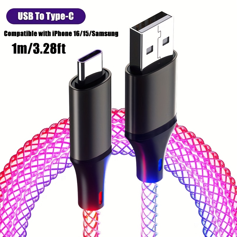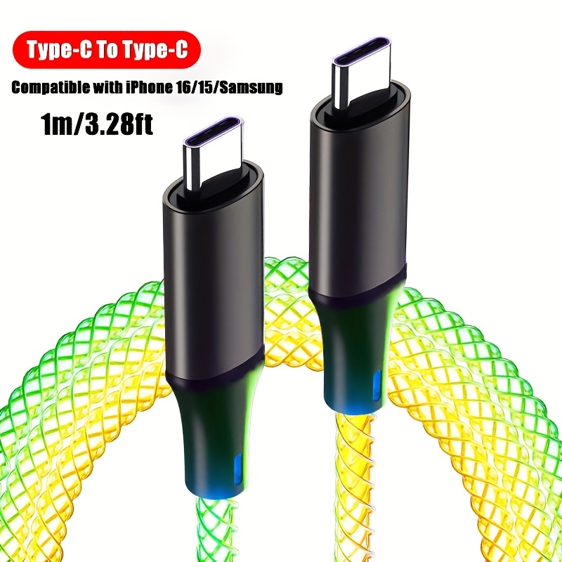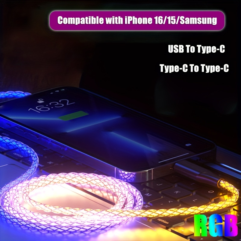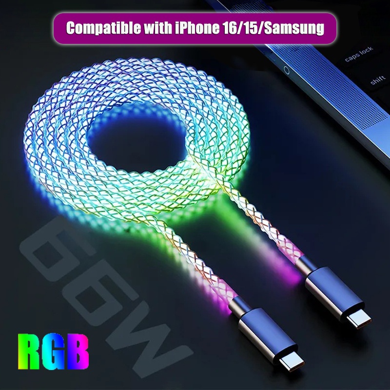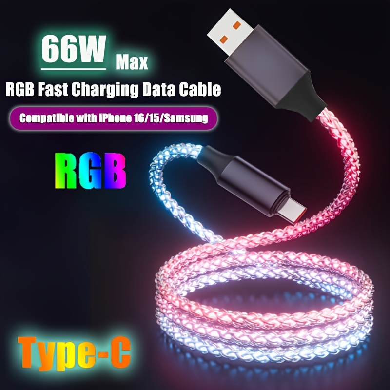 8 avis pour Câble RGB de charge rapide Type-C/USB vers Type-C PD 66W Max Breathing pour iPhone 16/15 Series pour for Samsung S24 S23 S22 Xiaomi 14 13Pro K60 K50 Redmi OPPO VIVO Cordon de charge rapide pour appareils Type C pour Power Bank Chargeur USB de voiture Ligne de données de charge rapide USB C