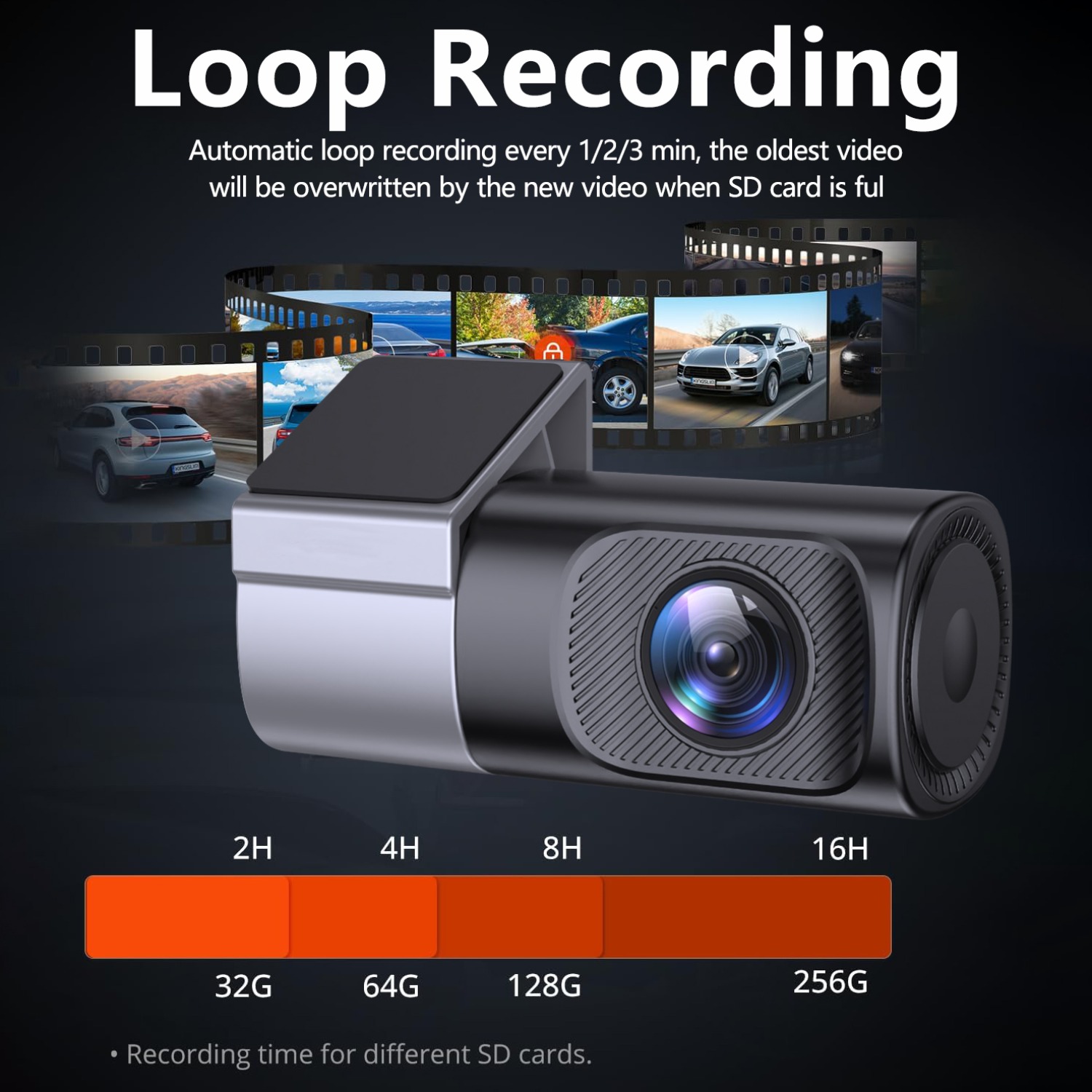 Enregistrement en boucle continue et capteur : Une fois la carte mémoire pleine, les derniers enregistrements remplaceront les précédents. Activé par un capteur, il peut détecter des mouvements brusques ou des impacts et sécuriser l’enregistrement pour s’assurer qu’il ne soit pas effacé pendant le processus d’enregistrement en boucle.