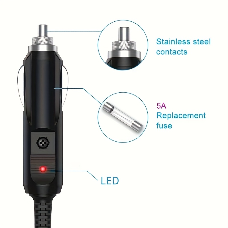 Tension d’entrée : DC12V/24V (le briquet pour fumer ne change pas de tension) Tension de sortie : DC12V/24V (le briquet pour fumer ne change pas de tension) Diamètre extérieur : 5,5 mm Diamètre intérieur : 2,5 mm Caractéristiques : 1. Alimentez instantanément votre appareil 12V à partir de la prise allume-cigare. 2. Indicateur LED pour l’état de l’alimentation. 3. Fusible remplaçable de 5 Ampères intégré pour protéger le système électrique de votre voiture et votre appareil.