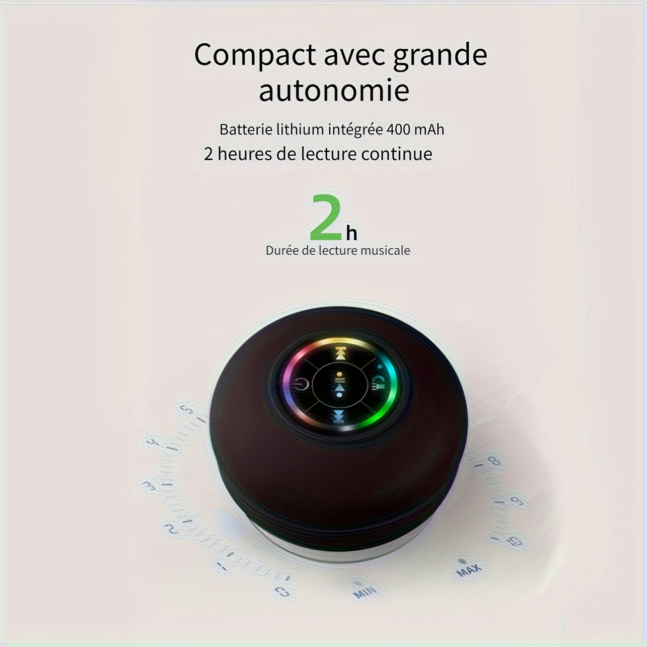 Cet appareil est petit et compact. Il est facile à transporter et offre un son agréable. Il a une jolie couleur et des lumières mignonnes qui bougent au rythme de la musique. C’est vraiment sympa. Merci beaucoup.
