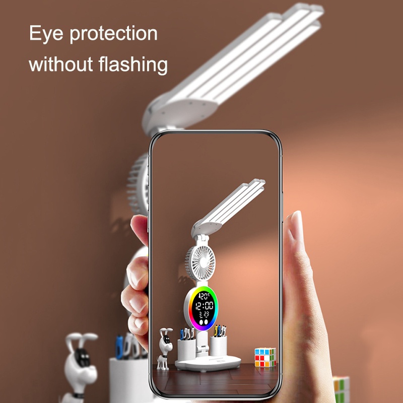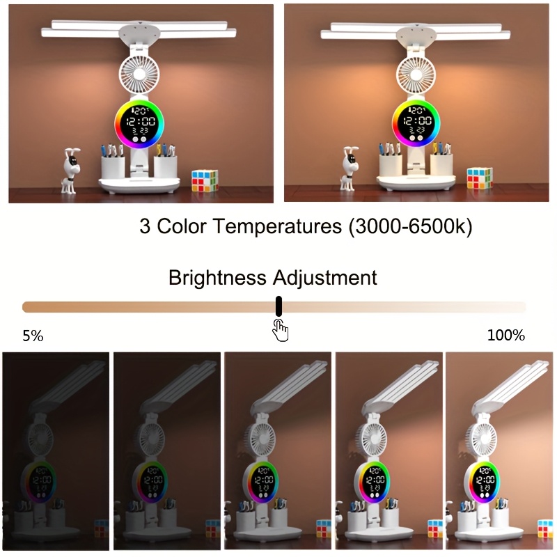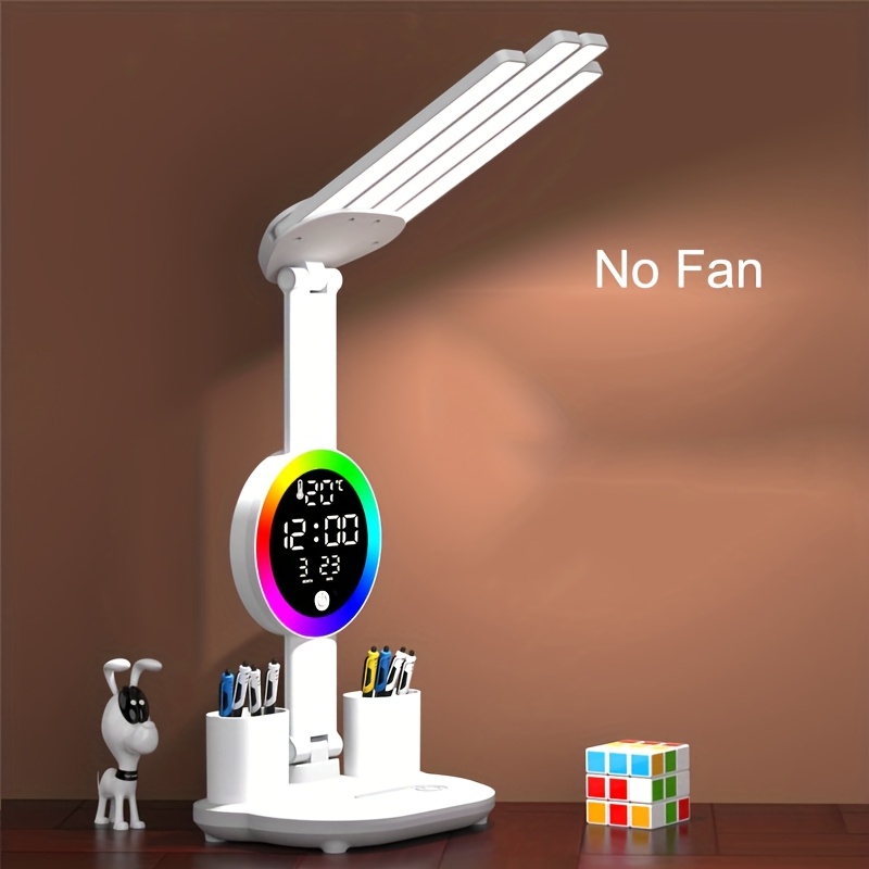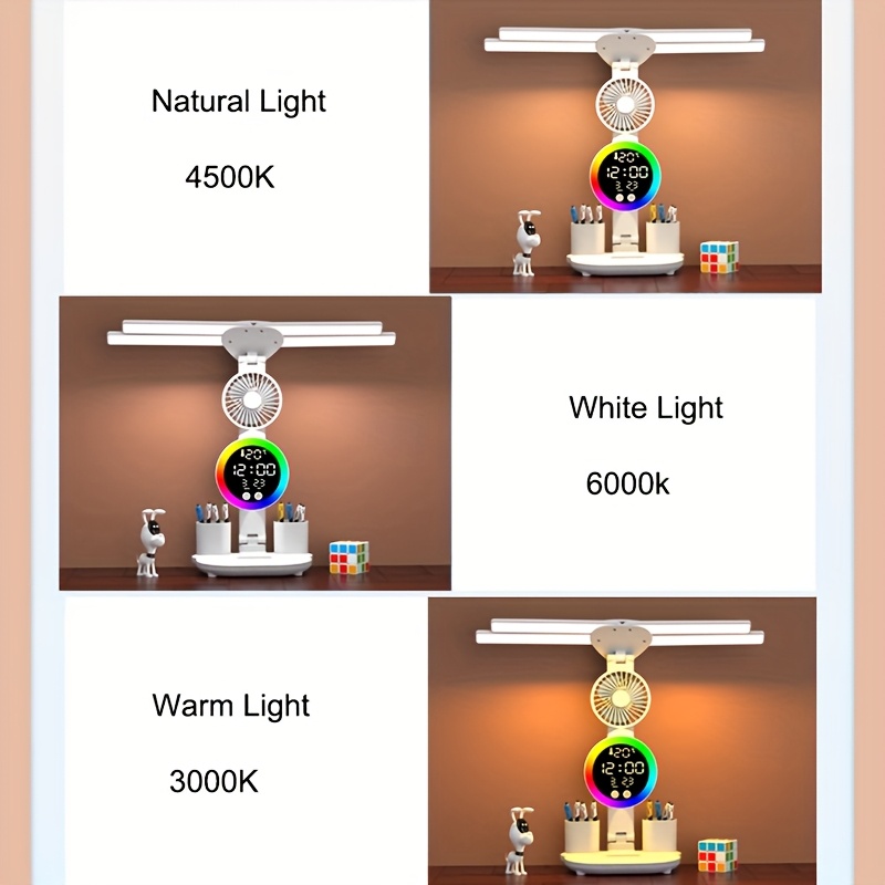 1. Alimentation Type-C (batterie rechargeable non incluse) 2. Trois types de lampes (quatre têtes avec ventilateur / quatre têtes sans ventilateur / tête ronde avec ventilateur) 3. L’arrière de la lampe est doté de boutons pour fixer la date et l’heure. 4. Chaque lampe offre trois options de couleur (blanc / naturel / chaud) 5. L’écran affiche la température, l’heure et la date.