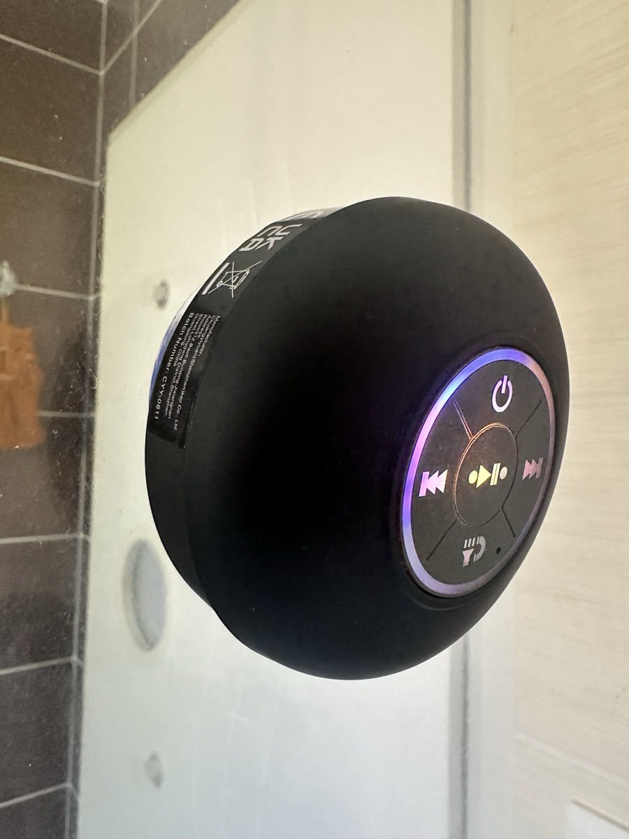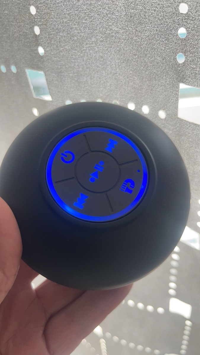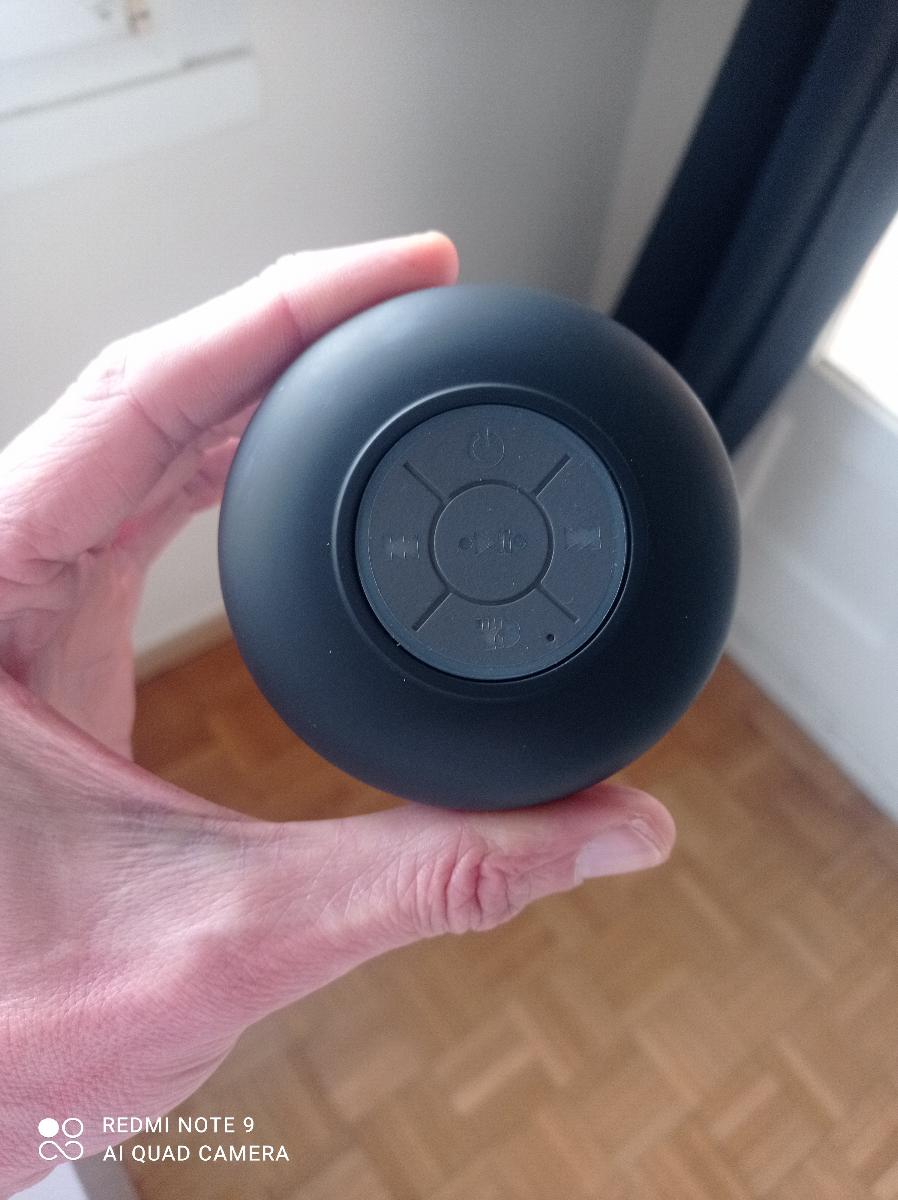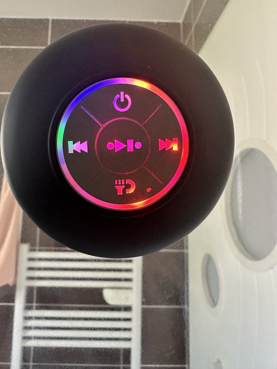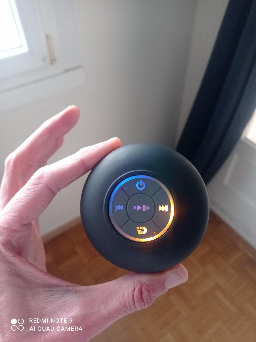 8 avis pour Mini Haut-Parleur LED de Salle de Bain, Enceinte Sans Fil Compacte avec Chargement USB, Batterie, Contrôle par Bouton et une Grande Ventouse Incluse