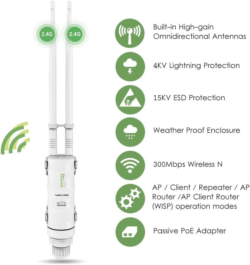 Le Wavlink N300 est un répéteur WiFi extérieur haute puissance conçu pour étendre la couverture réseau sur de longues distances. Grâce à sa fréquence 2.4 GHz et ses antennes longue portée, il assure une connexion stable dans les grands espaces : jardin, entrepôt, chantier, exploitation agricole ou site isolé.